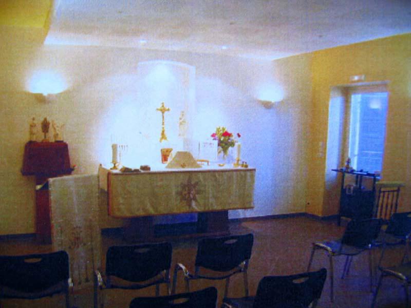 La chapelle occupe le rez de chaussée du bâtiment avec les trois ouvertures sur le coté droit. Il a été possible de réaliser une chapelle avec les dépendances nécessaires : sacristie, rangements, sanitaires.